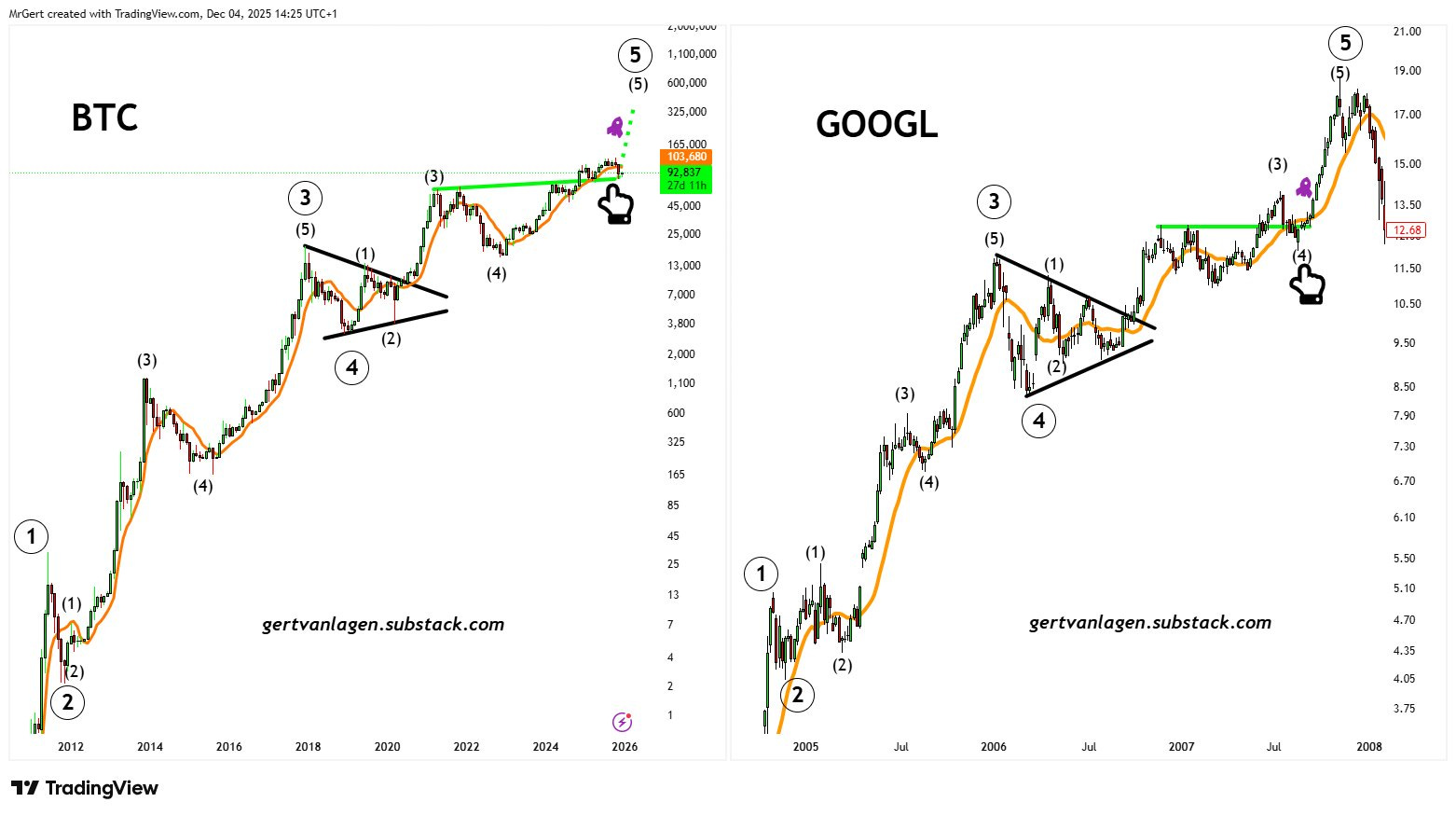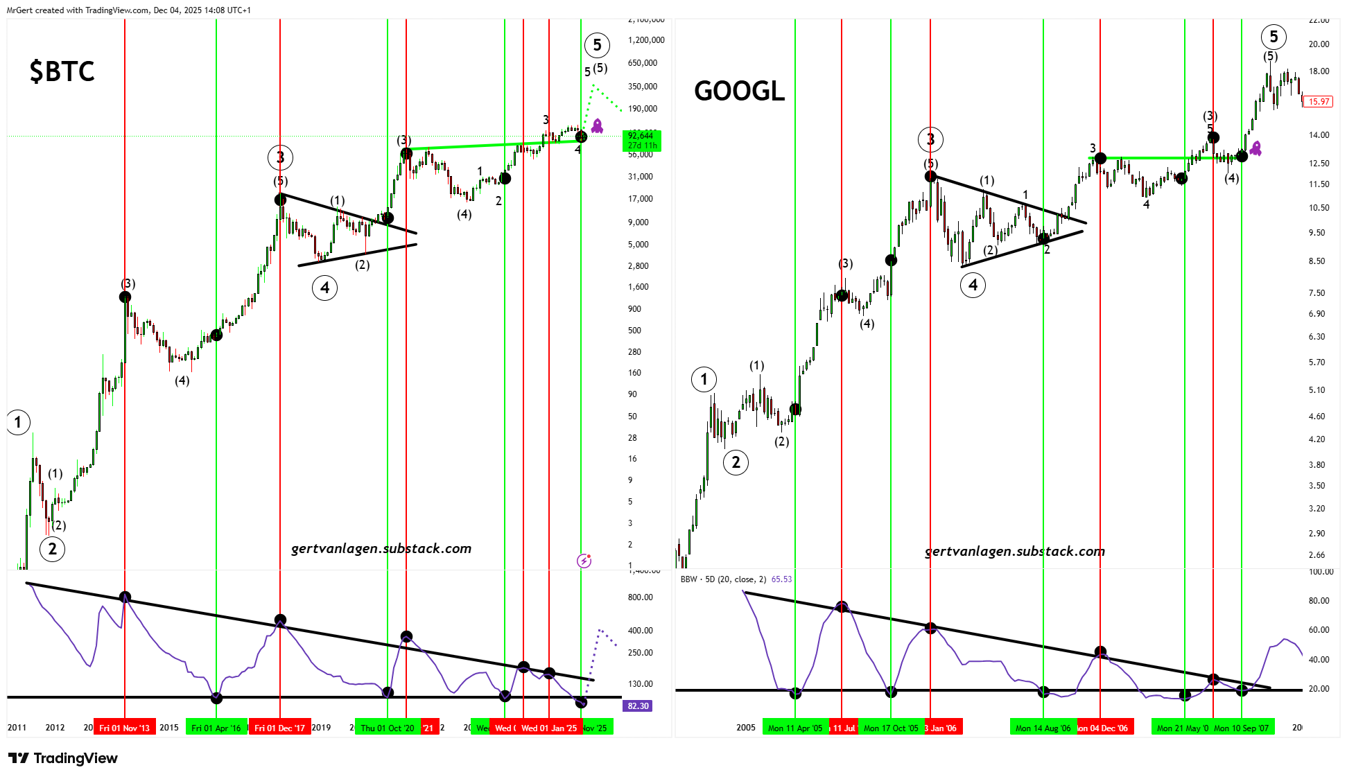 Bitcoin is echoing GOOGLās preāblow-off ā07: same Bollinger Bandwidth squeeze, same Elliott Wave rhythm.
